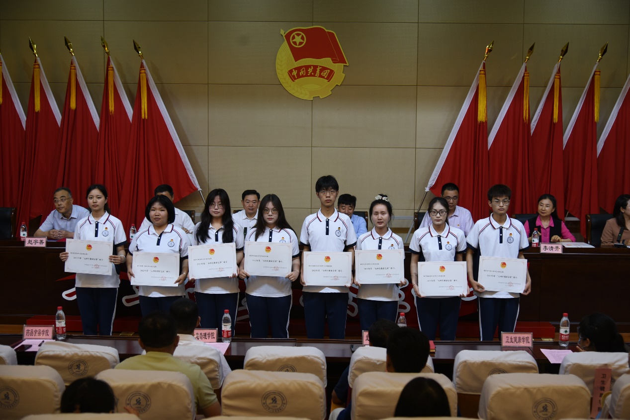 大会在庄严的国歌中拉开序幕,六位团员青年激情朗诵诗歌《在高质量发展中续写青春荣光》献礼祖国。强承魁宣读《关于表彰2022年度共青团工作先进集体和优秀个人的决定》,学校领导和相关处室负责人为获奖代表颁发了荣誉证书,生态环境学院环境工程专科21班翟茂程同学代表获奖学生发言,农林工程学院植保专科22班周佳媛同学宣读《 五四倡议书》。