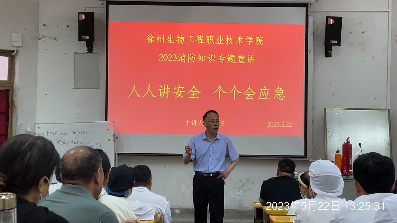 在安全知识讲座上,学校食堂、宿管人员、后勤保障人员120余人参加学习。安保处黄洪松副处长要求大家认真学习消防知识,学以致用,保证每个人都会使用灭火器材,压实消防安全管理责任,杜绝安全事故的发生。徐州市安宣应急技术有限公司仇星阳教官结合工作和生活中用电、用气、用火的知识及火灾案例,讲解了发生火灾后的自防、自救等逃生技能,详细介绍了相关灭火救生设备的使用方法,取得较好的效果。