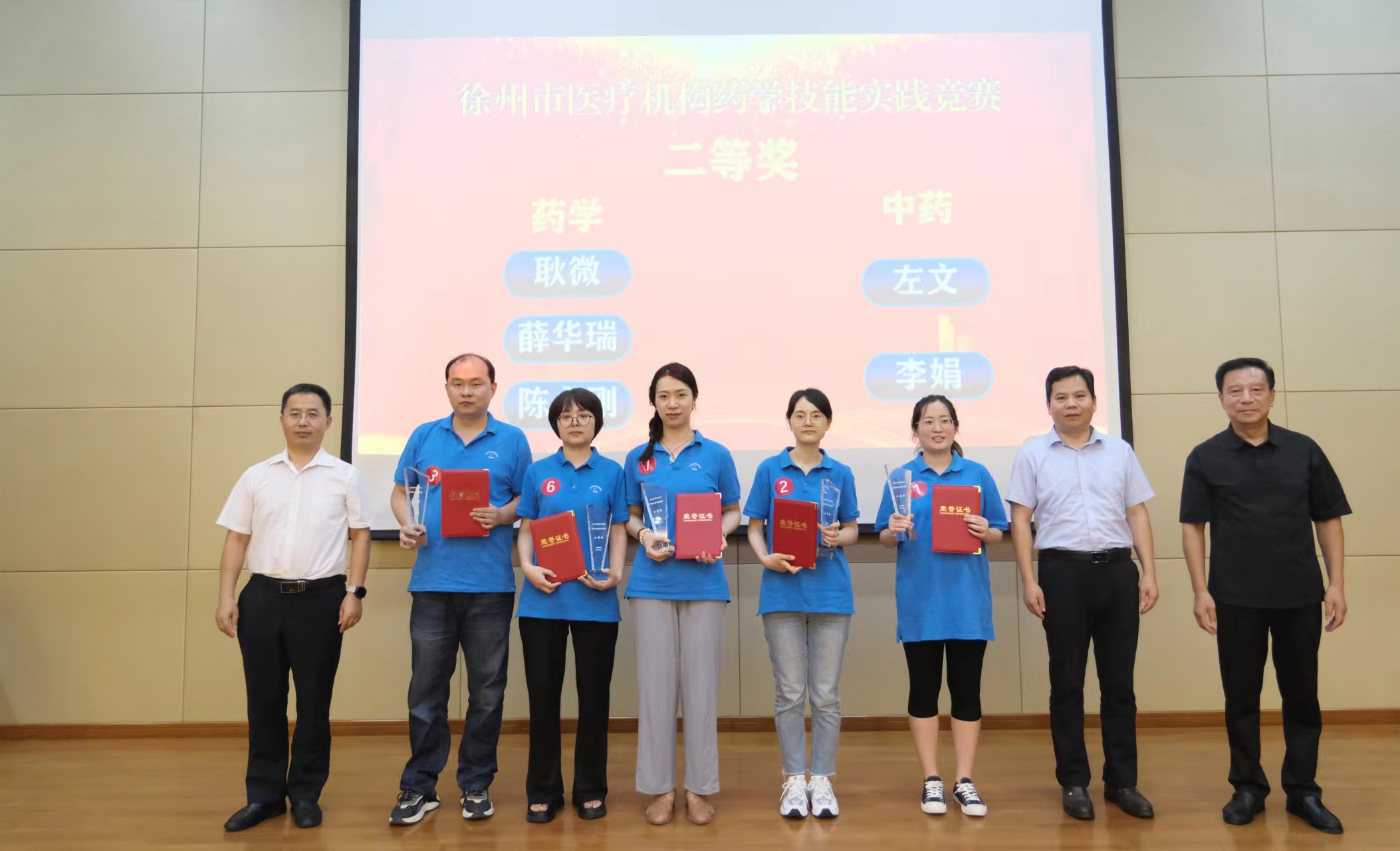 7月21日,由徐州市卫生健康委员会、徐州市总工会、徐州市药学会主办,我校承办的2023年徐州市医疗机构药学技能实践竞赛在我校成功举办。徐州市总工会副主席王建民、徐州市卫生健康委员会副主任杨洪涛、徐州中医药管理局副局长姜勇、校党委委员副校长赵虎、徐州市药学会理事长陈建民等出席并为获奖选手颁奖。我校药品食品学院100多名师生现场观摩学习,其中宋凯、吴江涛、于秋菊、蔡琳等四名教师执裁决赛阶段比赛。