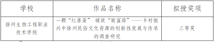 近日,共青团江苏省委对第十八届“挑战杯”全国大学生课外学术科技作品竞赛“红色专项”活动江苏省选拔赛拟授奖情况进行公示,由农林工程学院和动物工程学院共同打造作品《一颗“红喜蛋”铺就“致富路”——乡村振兴中徐州民俗文化资源的创新性发展与传承的调查研究》获评三等奖,这是我校在省“挑战杯”竞赛中继“黑科技”专项赛后斩获的又一奖项。