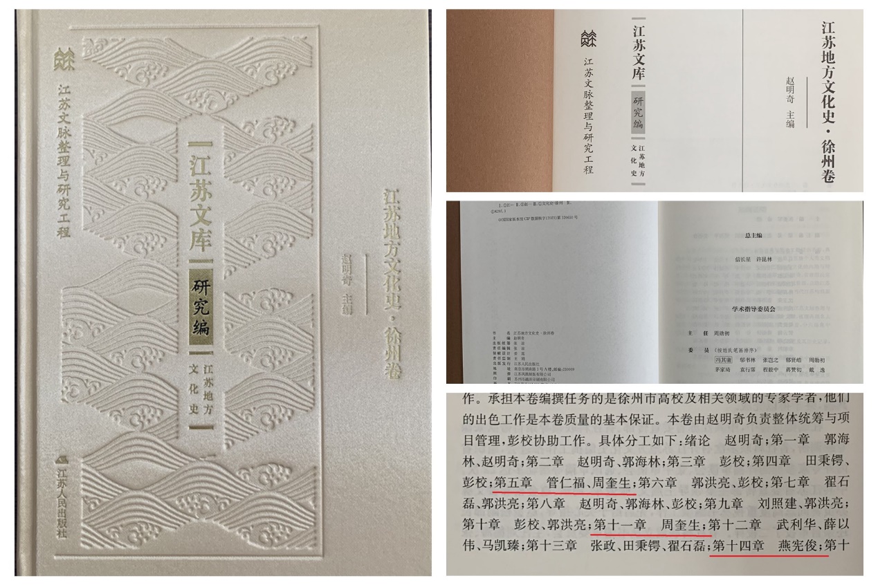 近日,江苏省社科基金重点委托项目、江苏文脉整理与研究工程项目成果——《江苏地方文化史· 徐州卷》由江苏人民出版社正式出版发行。该书由江苏师范大学博物馆馆长、教授赵明奇担任主编,编撰团队集聚了在徐高校、博物馆、文史研究单位等20多位文史专家,其中就有我校基础部周奎生和燕宪俊两位副教授。周奎生老师具体负责编写了第十一章《文学创作》,并参与了第五章《隋唐宋元时期》部分内容的编写与整章润色,燕宪俊老师具体负责编写了第十四章《方言文化》。两位老师长期致力于徐州文史和方言、民俗研究,积累较为丰厚,在编撰过程中,注重将文献资料与考古发掘成果相印证,辅以实地考察,获得了大量第一手资料,为该书充实了很多详实内容,发挥了不可或缺的作用。