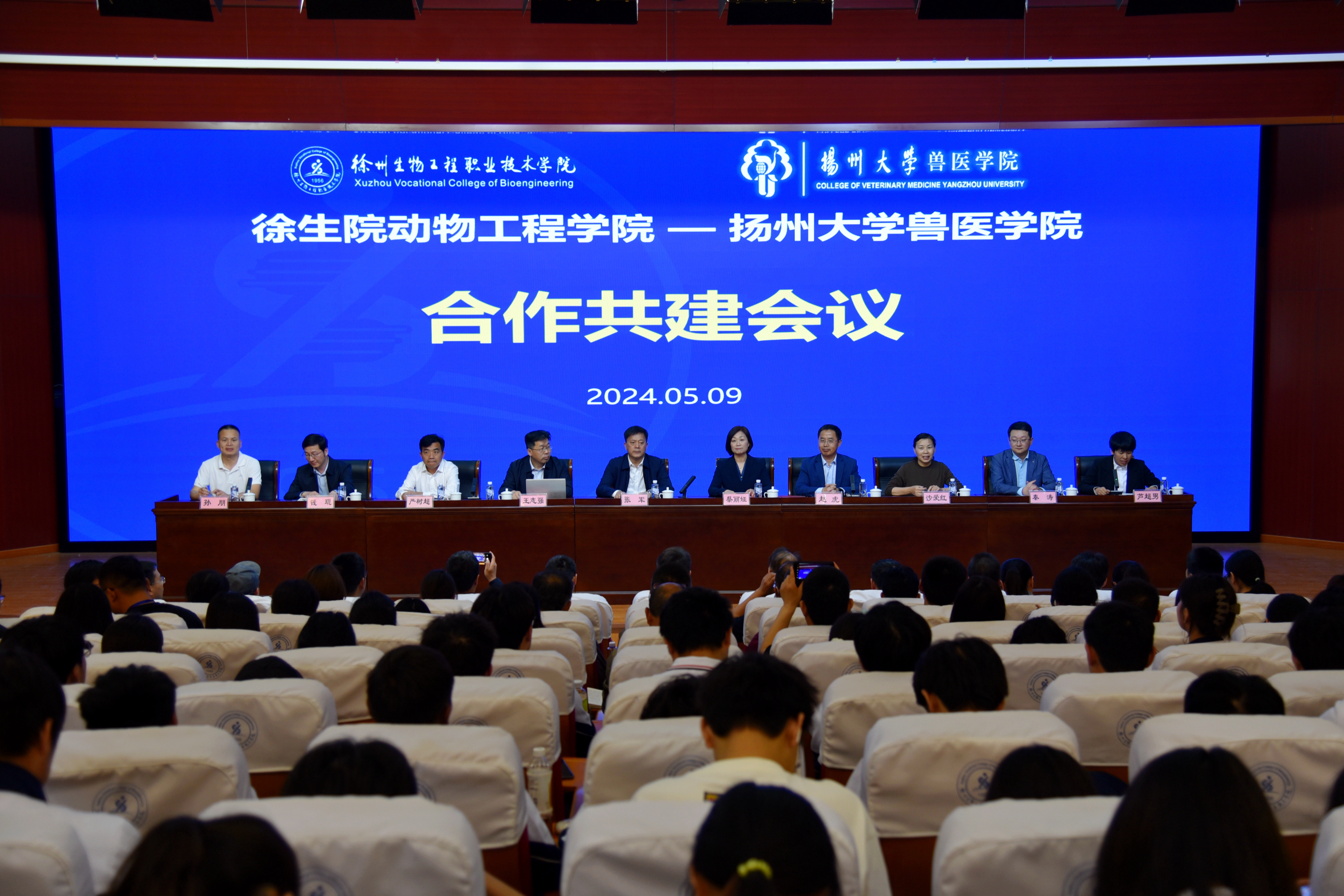 为充分发挥扬州大学兽医学院与我校动物工程学院的资源优势,进一步加强双方学院间的合作交流,共同推动教学科研和人才培养质量的提升,5月9日下午,我校动物工程学院与扬州大学兽医学院合作共建会议在校学术报告厅隆重举行。扬大兽医学院党委书记蔡丽娅、院长王志强、党委副书记沙爱红、副院长钱琨、副院长秦涛,我校党委副书记、校长张军,党委委员、副校长赵虎,党委委员、组织部部长严树超,动物工程学院党总支书记芦超男、院长孙朋和双方学院教师代表出席本次会议。