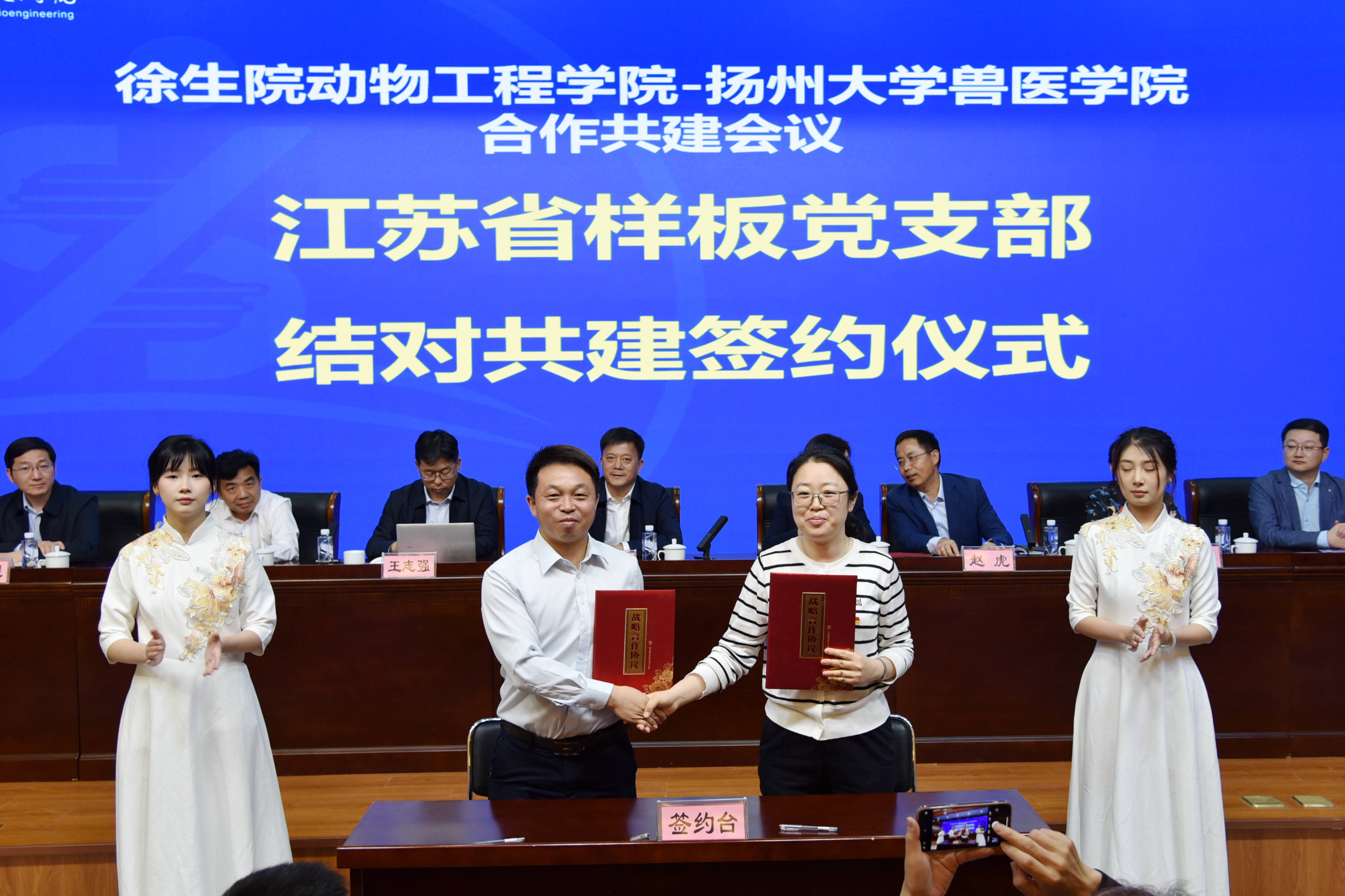 王志强、孙朋分别介绍了各自学院的事业发展情况。双方学院代表共同签订了徐州生物工程职业技术学院动物工程学院-扬州大学兽医学院战略合作协议、江苏省高校优秀科技创新团队共建协议、江苏省样板党支部结对共建协议和青年教师帮扶结对协议。张军、赵虎、严树超为扬大兽医学院秦涛、李金贵、陈南华三位专家颁发了校外导师聘书。