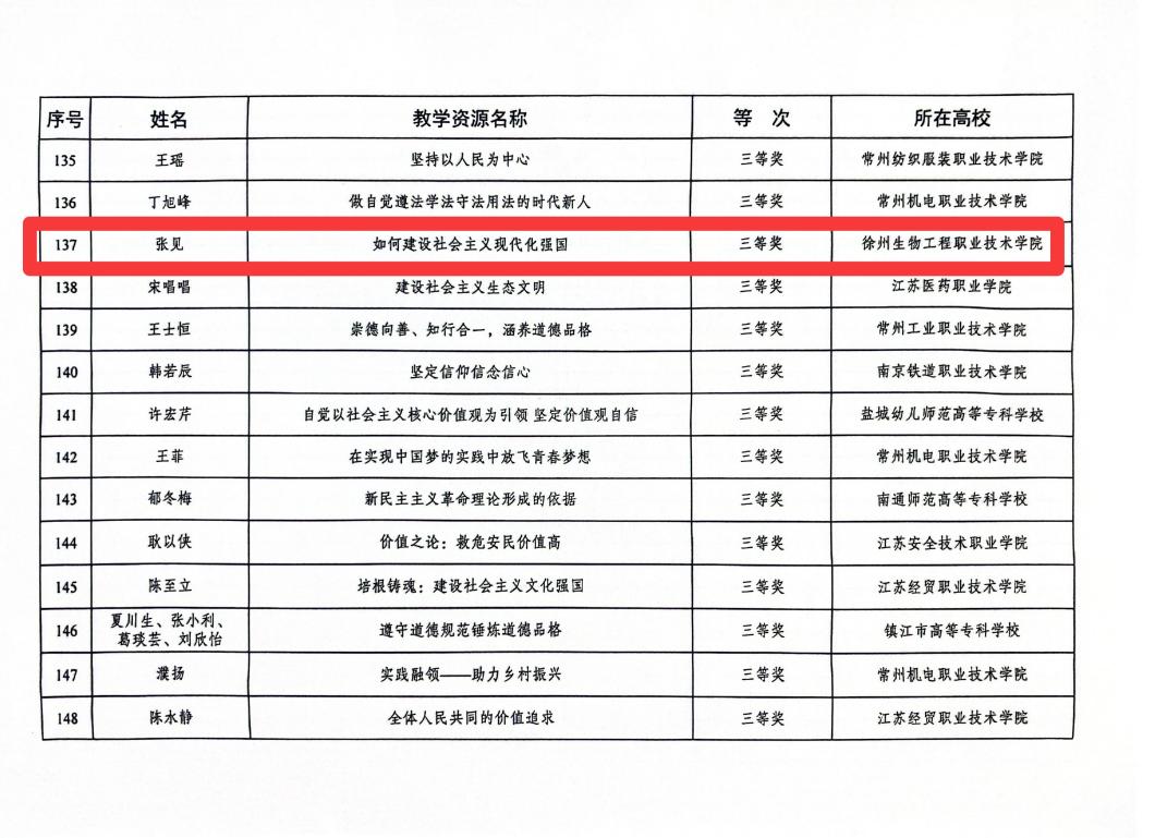 近日,江苏省高校思政课教学指导委员会发布《关于公布江苏省高校优质思政课教学资源建设获奖名单的通知》。本次评选活动分为“新时代伟大变革”专题、教学重点难点精讲教案和优秀教学案例3个类别。经评审,我校马克思主义学院教师张见撰写的案例《如何建设社会主义现代化强国》荣获“教学重点难点精讲教案”类别三等奖。