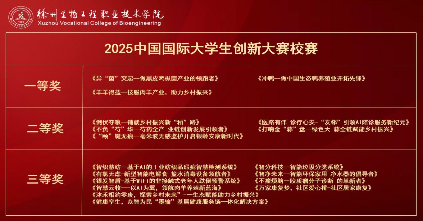 本次校赛设置了职教赛道和“青年红色筑梦之旅”赛道。经学院初赛,共有18个项目进入学校决赛,决赛采取路演和答辩的形式,评委现场打分。经过激烈角逐,最终评选出《异“菌”突起——做黑皮鸡枞菌产业的领跑者》、《冲鸭——做中国生态鸭养殖业开拓先锋》、《羊羊得益——技服肉羊产业,助力乡村振兴》3个项目获一等奖,《倒伏夺梁——铺就乡村振兴新“稻”路》等5个项目获二等奖,《智织慧纺——基于AI的工业纺织品瑕疵智慧检测系统》等10个项目获三等奖。